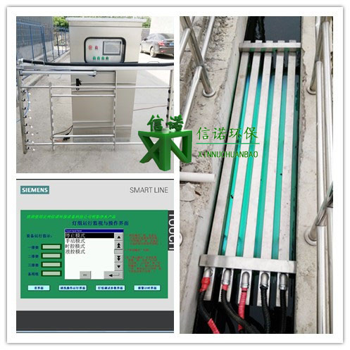 信諾明渠式紫外線系統(tǒng)消毒設(shè)備模塊安裝于開放式紫外消毒渠中,為了維修方便,配電柜及控制柜均安裝在水渠上方。紫外光燈管排架排列于明渠中,紫外燈管與水流方向一致平行排放!